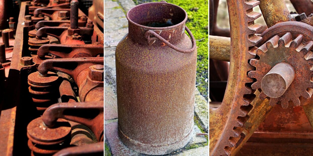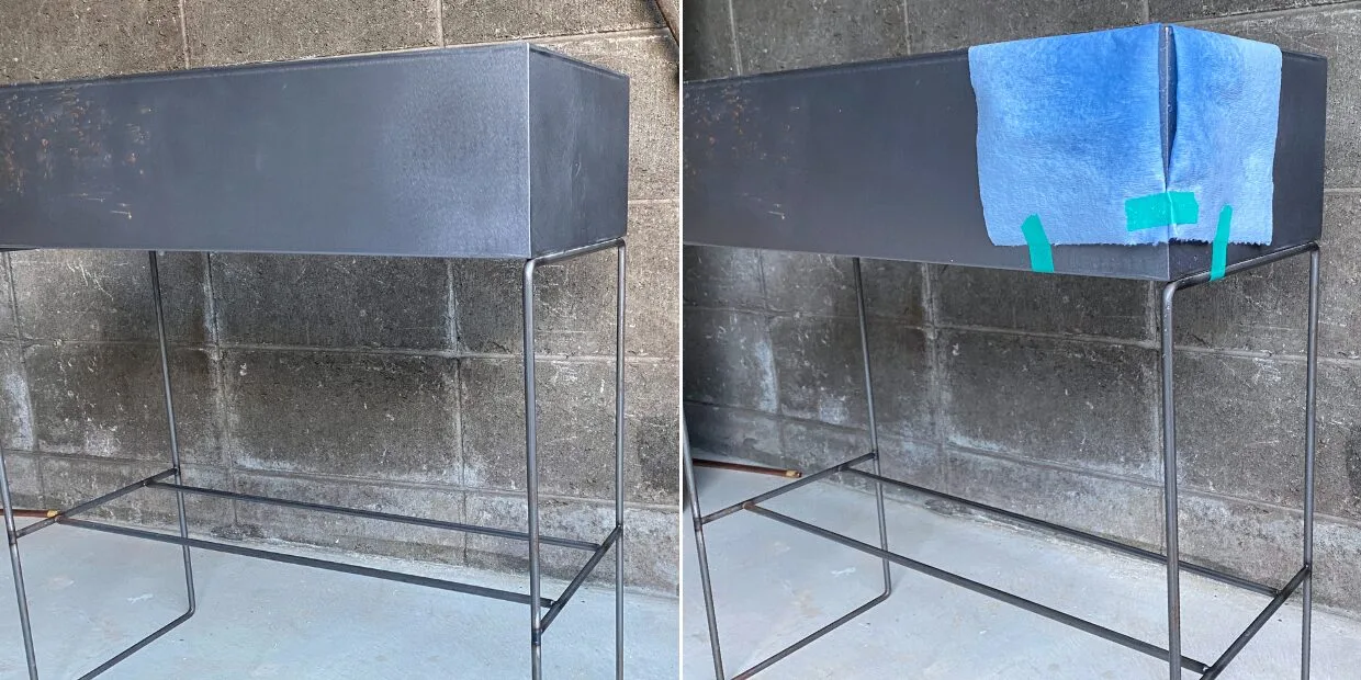 理想の錆びは、右写真のように雨風にさらされて自然にできたグラデーションのある錆びです。全面を急速に錆びさせようと思えば、ハイターやサンポールなどの強力な薬剤を使うことも可能ですが、実験できるプランタースタンドは1台しかありません。そのため、どうやったら、どこまで錆びが進むかを検証するため、様々な手法で少しずつ試していきたいと考えています。