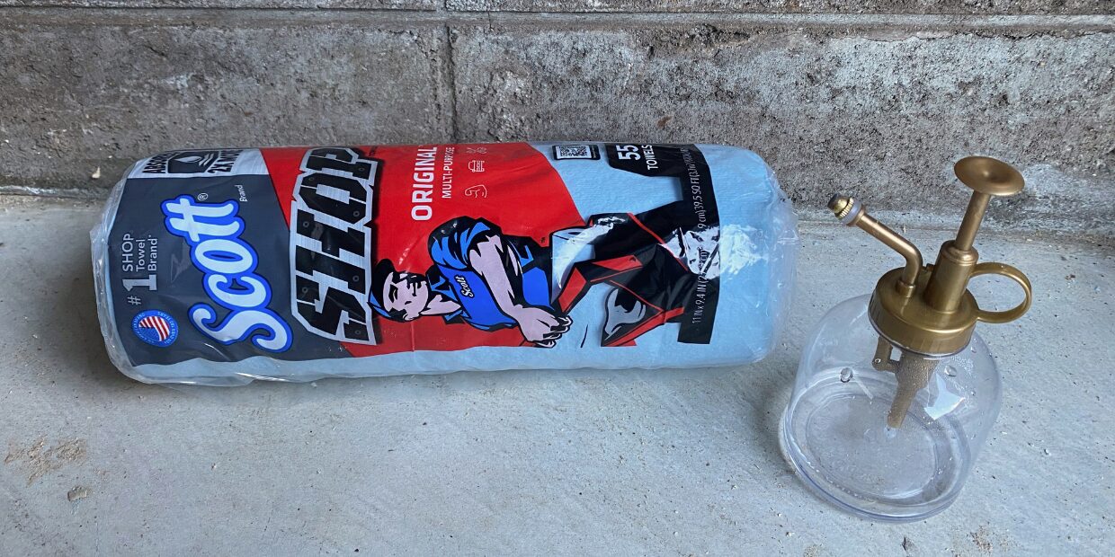 そこで今回は、これまでの霧吹き実験とはまた違った手法で錆びを発生させることにしました。スプレーで塩水をかけてもすぐに蒸発しないよう、ペーパーウエス(コストコのスコットショップタオル)を使用して集中的に水分を保持します。
