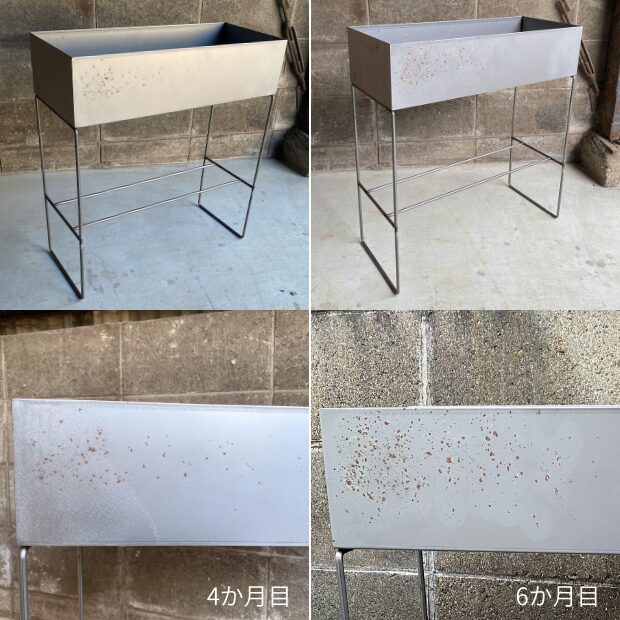 開梱から6か月が経過しました。何もせずただ放置しておくだけでは錆びの進行が緩やかで、見た目の変化をあまり感じられなかったため、2か月目に塩水を噴霧したことで、4か月目には錆びは劇的に変化しました。