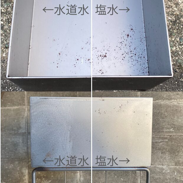 塩水をかけた箇所には、写真のようにたくさんの錆びが集中して発生しています。一方、水道水をかけた箇所にもポツポツと錆びが見られました。