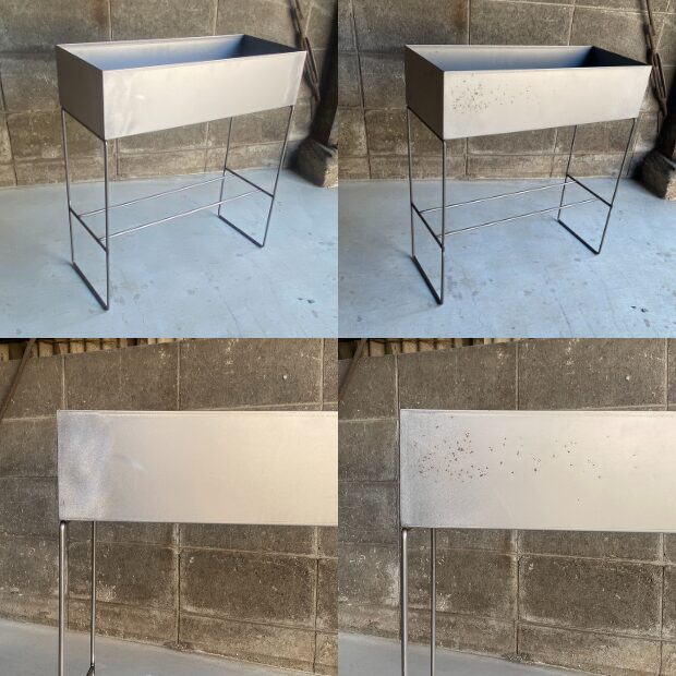 開梱から2か月目の時点で、梅雨を越したにも関わらず錆びの進行が緩やかだったため、あえて錆びを促進させるための実験を行いました。霧吹きを使って、プランタースタンドに2種類の水を噴霧し、その後の変化を観察しました。
