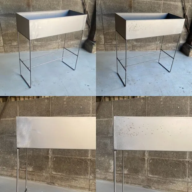 2種類の水による変化を見るため、プランタースタンドの半分は何もしないままにしておき、プランターと脚部分含めて、全体の1/4部分に塩水をかけ、飛び散った塩水を拭き取ってから、別の1/4に水道水をかけ、この状態でしばらく放置しました。